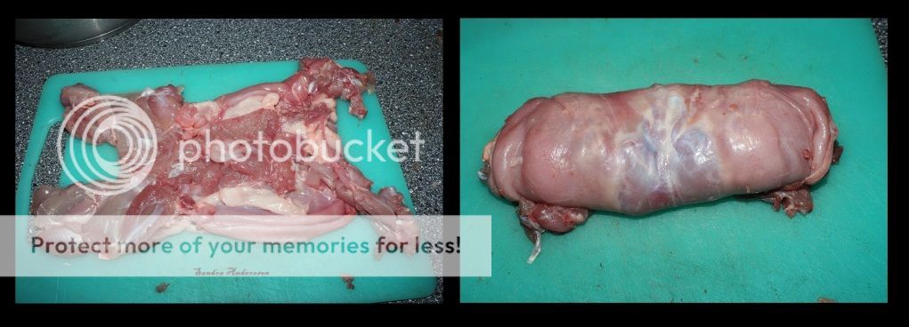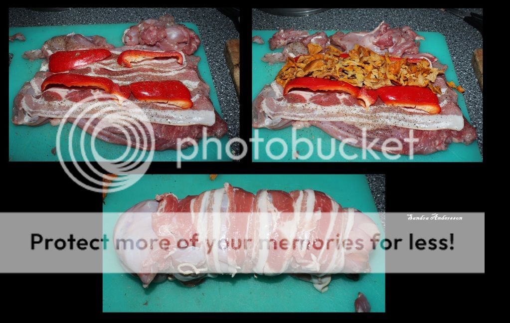 Skar loss lår och framben. Fyllde kaninen med bacon, paprika, kantareller, låren och vingarna (som det kallas) och kryddade. Rullade ihop den och klädde med bacon och band ihop med steksnören.