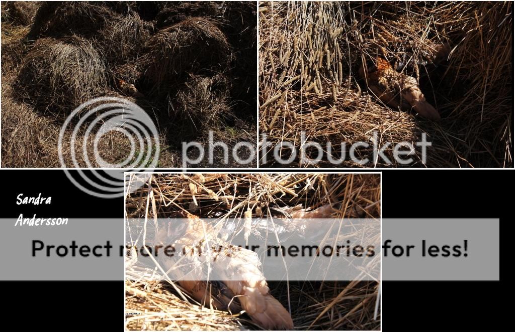 Seramaungdomarna skrämde slag på mig för några dagar sedan genom att "försvinna" när de var ute. Tankarna på vad som kan ha hänt flög åt alla håll (örn, hök, vildkatt, räv!?) - "Jag skulle aldrig ha lämnat de ensamma, men jag skulle ju "bara" gå och göra det" - Ångesten börjar kännas allt mer under tiden jag letar och utan att hitta dem! Så får jag plötsligt syn på något ... I dynghögen ... Det rör sig? Jag går fram och tittar närmare på vad det kan vara och där ligger de ju, hela gänget och sover! Budak och Coklat längst in i den lilla "grottan" de hittat, eller grävt fram och längst fram låg Sedikit med sin orange fjäderskrud som liknade halmen/höet och kamoflerade sig. ![]()