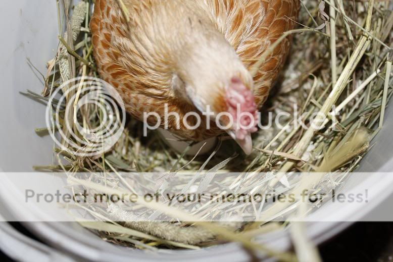 Fick syn på en liiiten hink som jag fick en Sebrighttupp transporteradi förut och då klickade det till! Jag fyllde den lilla hinken som förövrigt ser ut som det varit färg, lim... Fil, eller något liknande i(har inte tänkt på vad det är för etikett )med spån och hö. Jag ställde den sedan upp i andra änden av inhägnadenmen jag tänkte att, det där kommer de att välta! Men så fick jag enliten idé till. Snören! Jag trädde ett balsnören genom hönsnätet på buren och virade några gånger runt handtaget på hinken och... Klart!! Ovältbar och perfekt passform för de små! I med ett redägg och sedanvar det dags att kolla vad som hände. Inom 1 minut så såg det ut såhäri redet:
